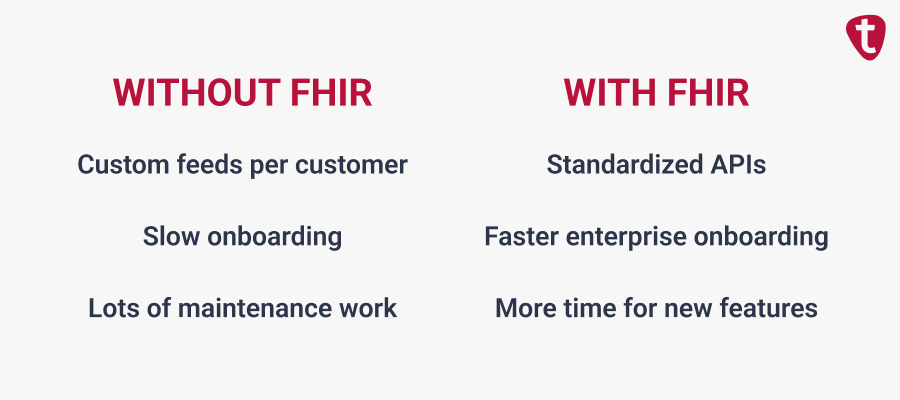 Yes. 2025+ buyers expect standardized, API-based access, not a collection of custom feeds. FHIR also makes it easier to add new customers without rewriting integrations each time. If you stick to one-off interfaces, your sales and onboarding teams will become the bottleneck.